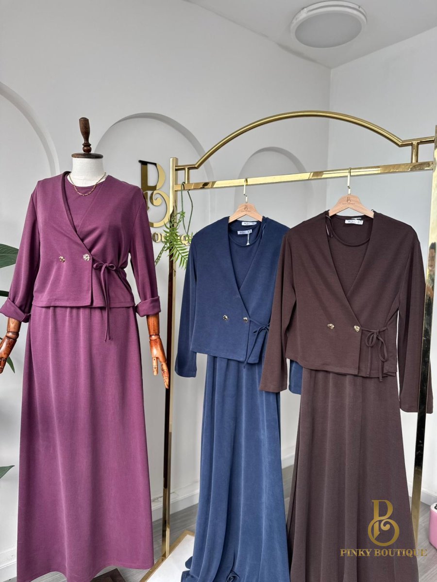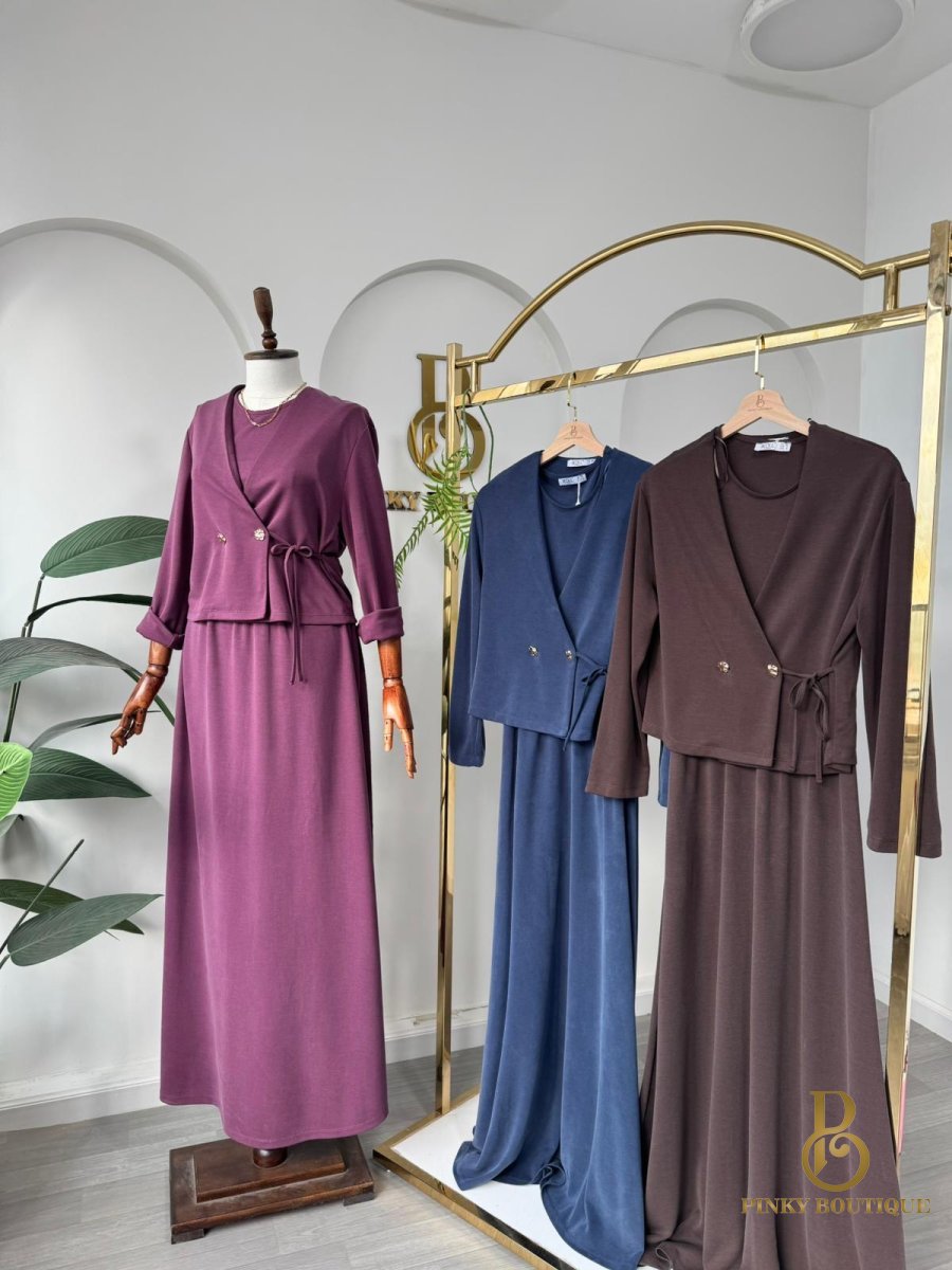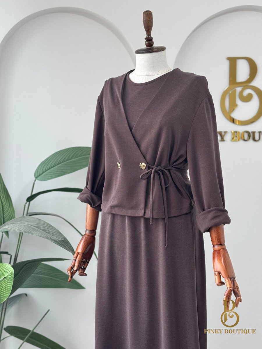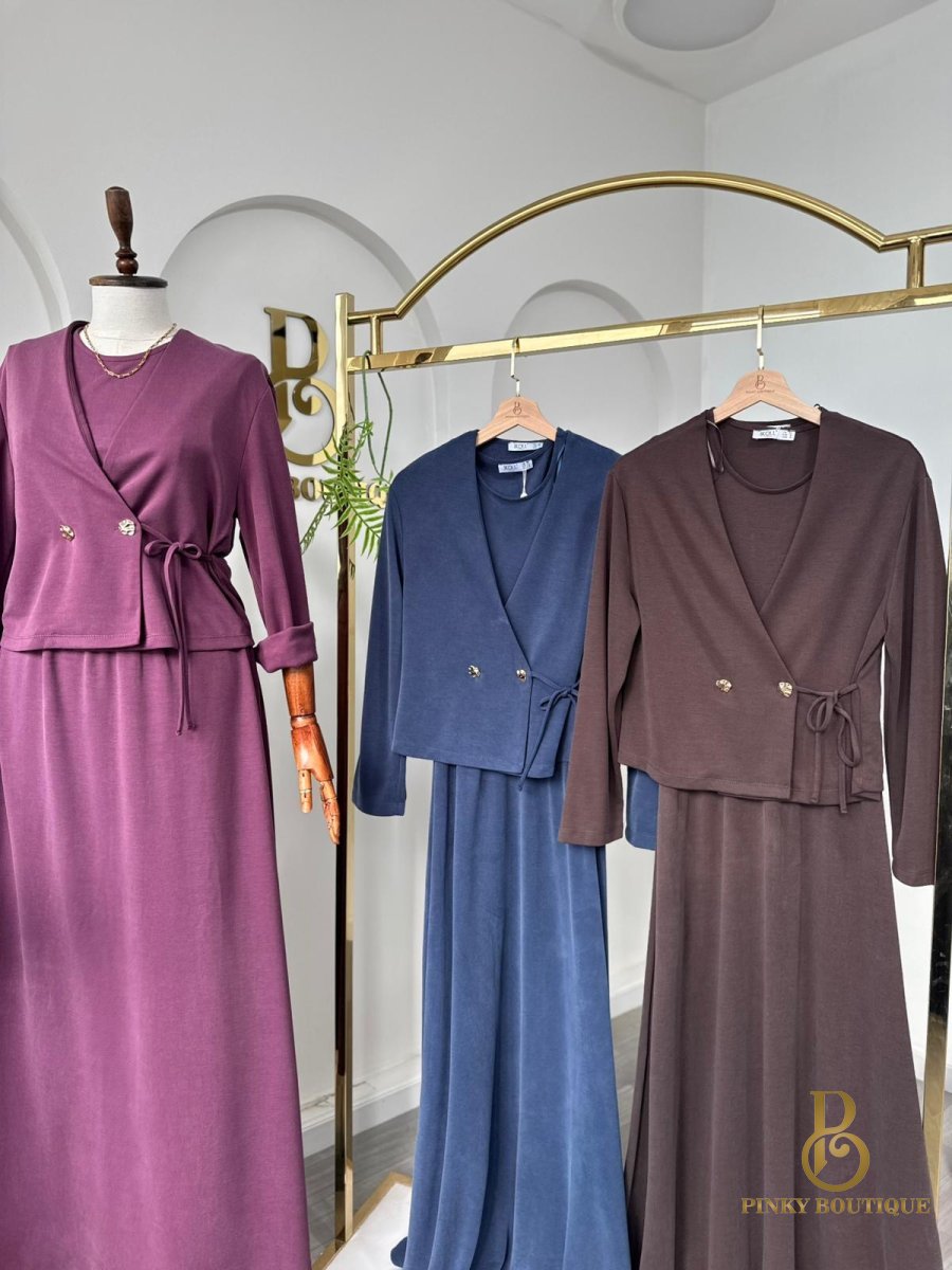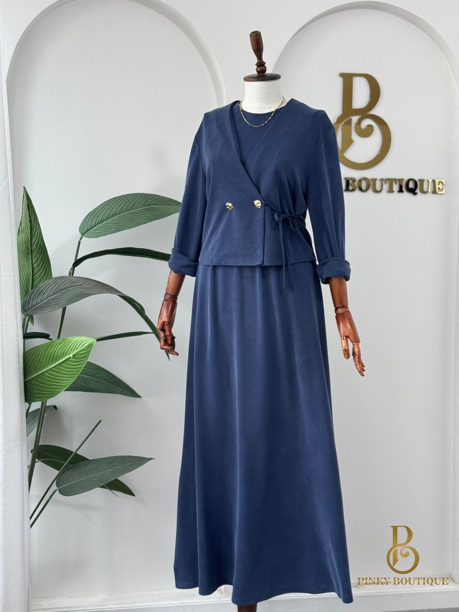 فستان كت وفوقه جاكيت بتسكر بزرين وربطه